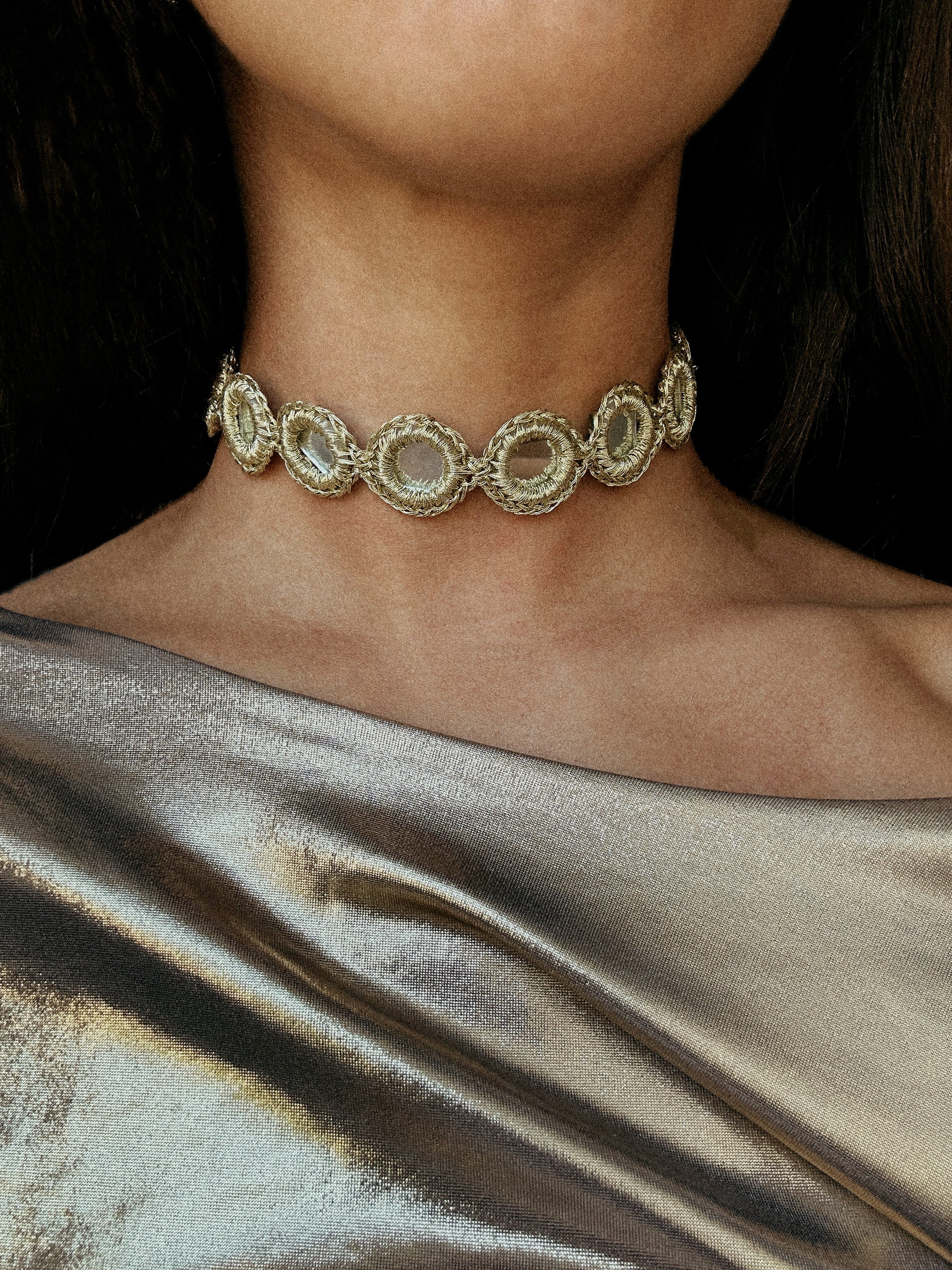 Este choker destaca por su sucesión de círculos bordados en hilo dorado de tono champagne y decorados con espejos ovalados. Su diseño simétrico genera un ritmo visual elegante y delicado. Es perfecto para elevar tanto estilismos diarios como de invitada.