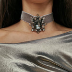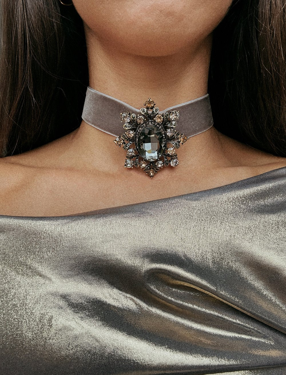 This light gray velvet choker is crowned with an oversized imperial-style brooch, featuring faceted crystals and a rhinestone frame. Perfect for special occasions, theater, or galas. A statement-making neck detail.