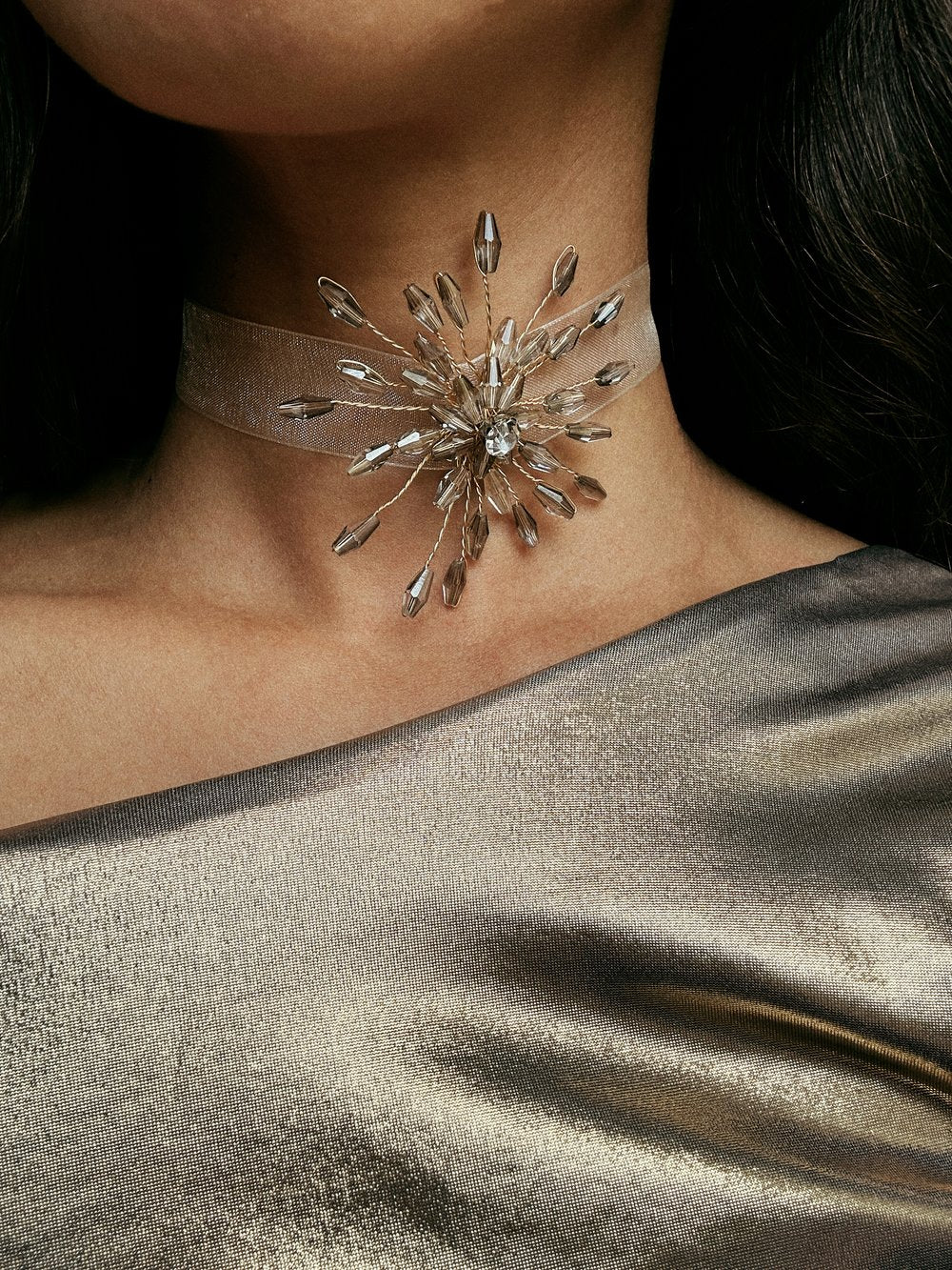 choker estrella cristal, collar celestial ahumado, joya etérea moderna, choker con brillo galáctico.